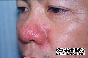 酒糟鼻的症状持久存在的红斑虽然本身既不痒,也不痛。但对容貌的美观影响至大,因为这种病理性红斑与健康人的面色红润并无共同之处。健康人的面色且然也有红如苹果机但这种生理性红润红得很均匀,主要位于颊部,而鼻子、印堂与下巴并不红,再免酒波鼻的红斑表面往往散布着一防粒的小疙瘩(丘疹)和小脓疤,模起来粗腿不平,而且要么油光发亮,要么层层脱屑,无怪乎假想此病的人都急于求医。